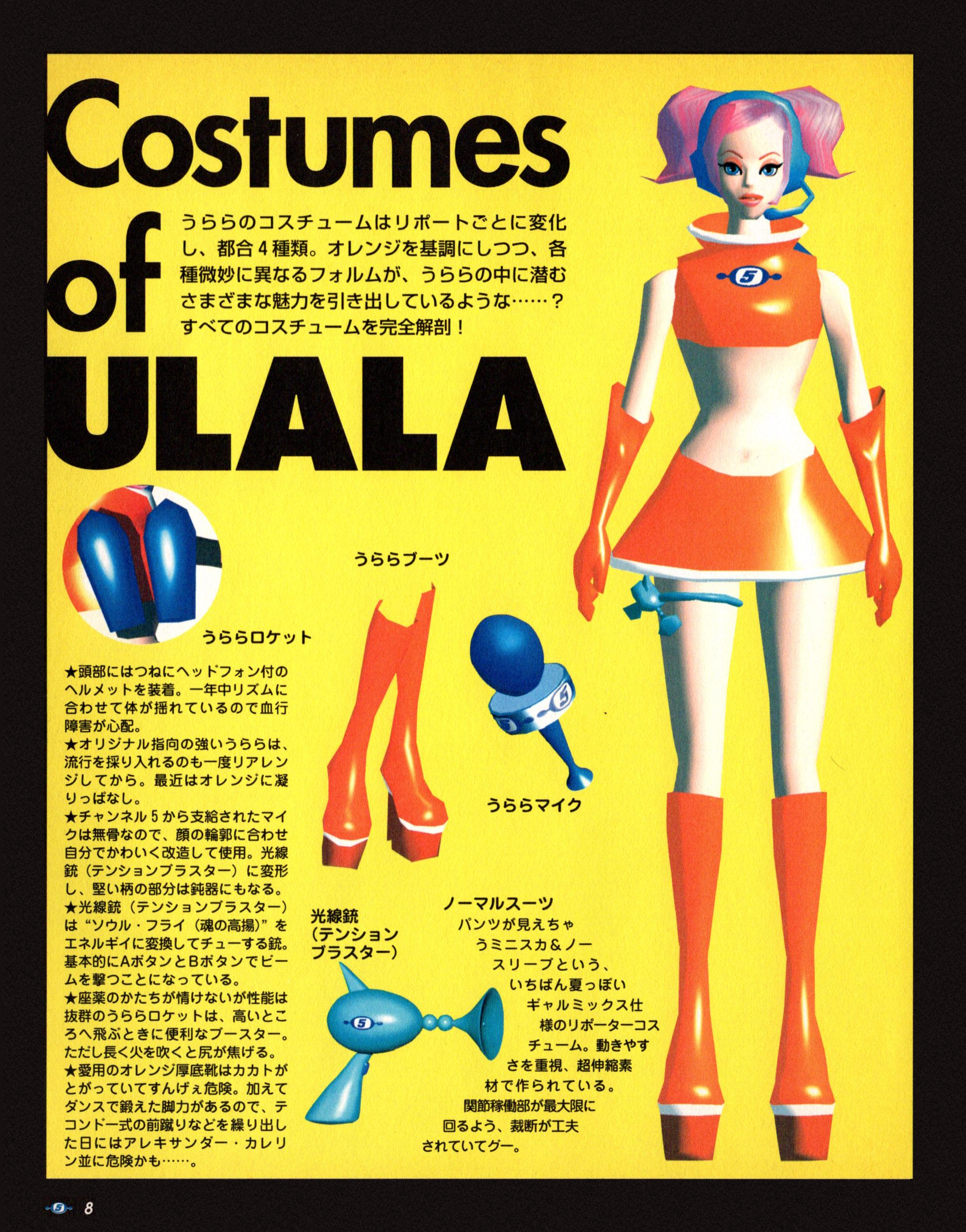 Fashionable Reporting in Shibuya is mostly dedicated to Space Channel 5's fashion aesthetic. It includes a two page spread describing the costumes Ulala wears thought out the game. It this section also contains several real-life outfits inspired by Space Channel 5.