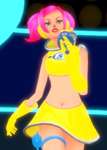 Ulala (Neon Yellow) Profile Number 002 "A Channel 5 reporter donning the latest in journalistic fashion. Though it looks like she's revealing bare skin, she is in fact covered from tip to toe in a deluxe polymer that keeps her protected even in the vacuum of space!"