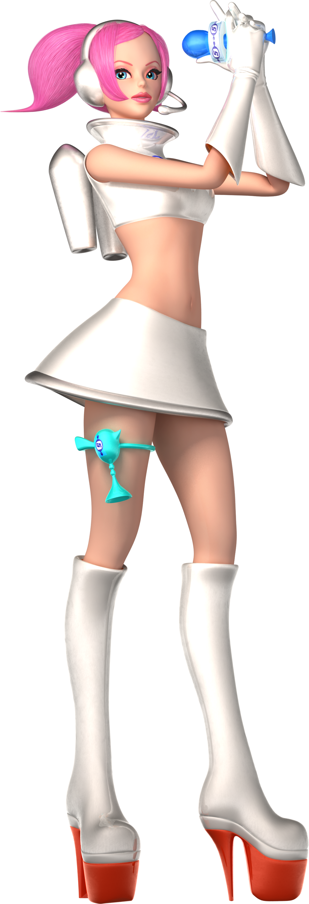 As with most characters in the series, Ulala has a canister on her back (in her case, two). These function as propulsion devices (as in Part 2, they combust to propel her through space). The color of these canisters often change. In Space Channel 5, they are blue to match her headset, while in Part 2 and VR, they match the metallic color lining her skirt and top.