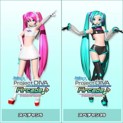 Hatsune Miku Project Diva and Project Diva Dreamy Theater:Hatsune Miku has two Space Channel 5 thematic modules. One called "スペースチャンネル5; (Space Channel 5)," in which she wears Ulala's retro gear and the other module based on Ulala's clothes called "スペースチャンネル39 (Space Channel 39)" in which Miku still has her color scheme, but her top resembles Ulala's with a pink "39" on it, her boots have tall heels like Ulala's boots, and she wears very short shorts.