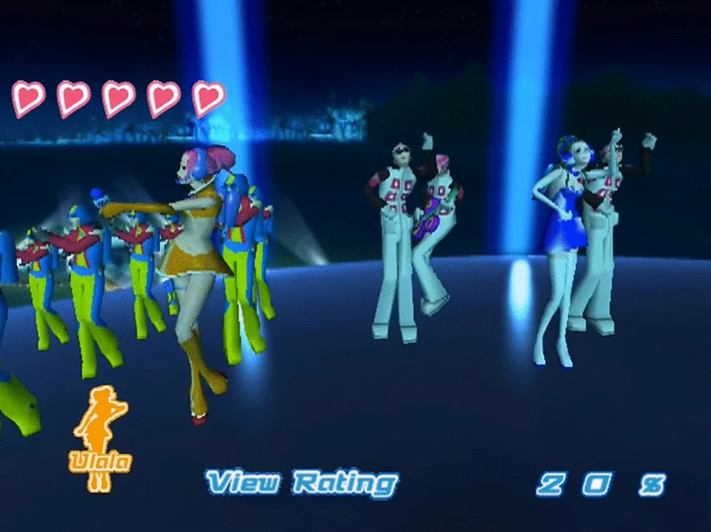 Ulala made her big-time debut with Ulala's Swingin' Report Show on Channel 5, covering an invasion at Spaceport 9, where she was surprised to discover that the Morolians were immobilizing their victims by using ray guns that force them to "dance". She made use of her tension blasters' beams to eliminate aliens and rescue hostages, respectively.