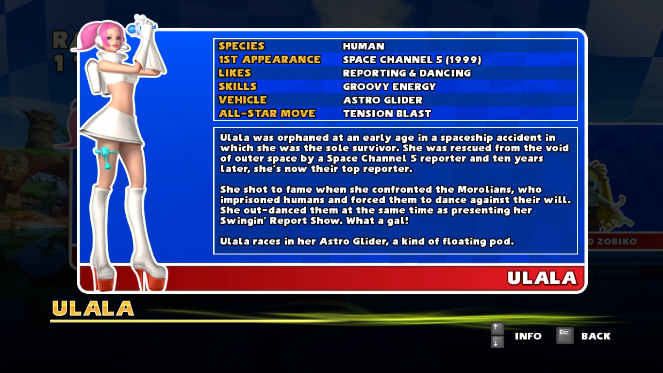 "Ulala was orphaned at an early age in a spaceship accident in which she was the sole survivor. She was rescued from the void of outer space by a Space Channel 5 reporter and ten years later, she's now their top reporter. "She shot to fame when she confronted the Morolians, who imprisoned humans and forced them to dance against their will. She out-danced them at the same time as presenting her Swingin' Report Show. What a gal! "Ulala races in her Astro Glider, a kind of floating pod."