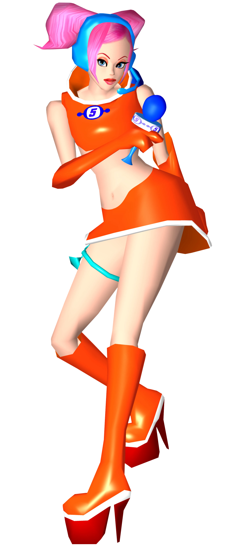 Ulala has light skin, long pink hair that is tied up in pigtails, and blue eyes. She wears pink lipstick and light red eyeshadow. In Space Channel 5, Ulala most often seen wears an orange top with a white border and the Channel 5 logo in blue, orange gloves, an orange skirt with a white border, a blue gun on her leg and orange knee-high, high-heeled boots with a white border and red soles. She also wears a blue headset.